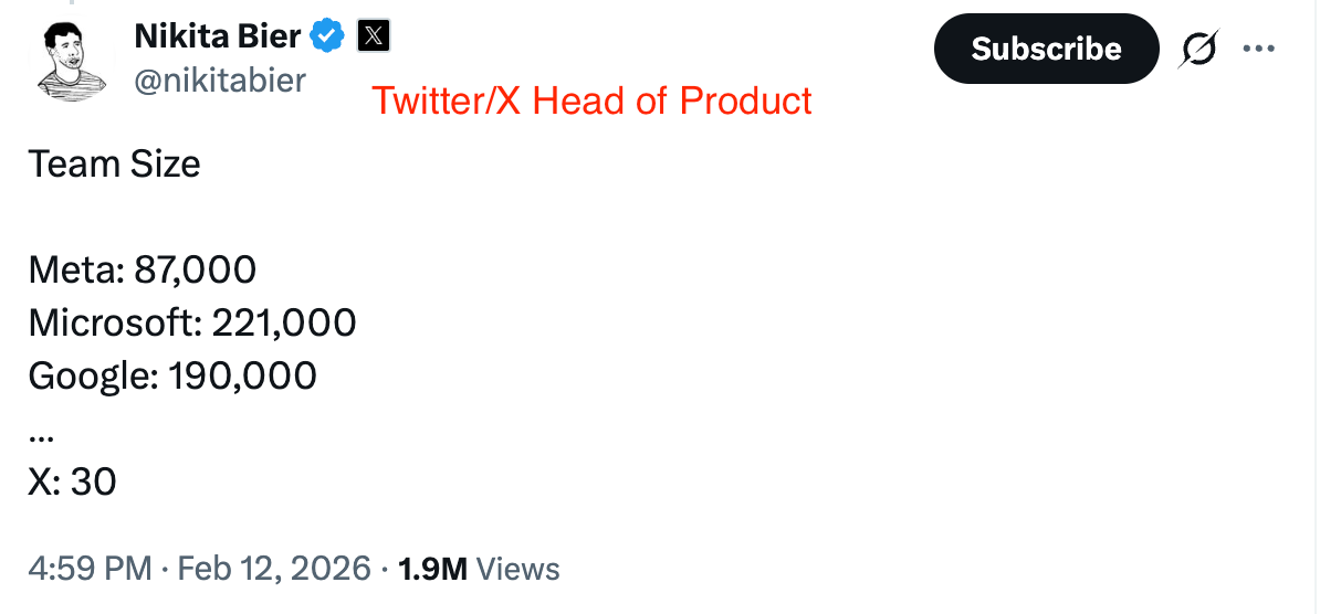 Twitter/X only has 30 people building their $1B ARR product with >500M active users - you just need a very small talent dense teams.